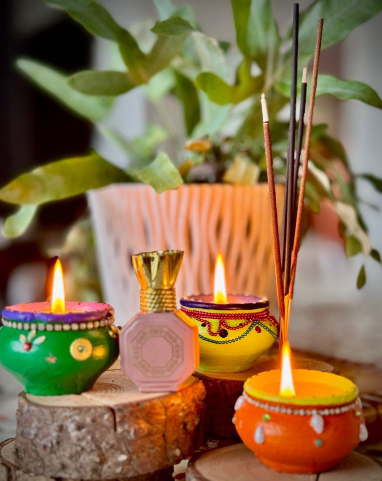 Nous proposons aussi des bougies en terre cuite, uniques et faites mains. De ce fait, chaque motif est différent. Nos bougies sont fabriquées dans les bidonvilles de Mumbai donnant, ainsi des revenus supplementaires aux familles.