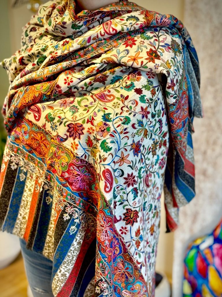 - Des écharpes en soie, en coton, en cachemire ou en chanderi (un textile purement indien qui est un mélange de coton, soie et un fil de zari qui donne un reflet iridescent).